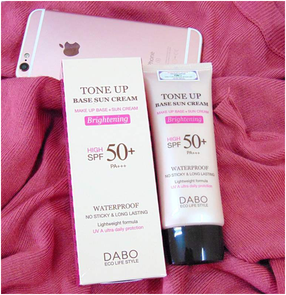 Kem chống nắng DABO Tone Up Base Sun cream còn có tác dụng chống ô nhiễm, ngăn chặn tia UVA& B với độ chống nắng rất cao với SPF 50 PA+++, đồng thời giúp che khuyết điểm trên da, hiệu chỉnh màu da bị xỉn và không đều màu làm cho làn da trở nên rạng rỡ hơn, tự nhiên hơn. Ưu điểm nổi bật đặc biệt của kem chống nắng DABO Tone Up Base Sun cream còn là không bị rửa trôi khi gặp nước hoặc mồ hôi, không gây nhờn dính, khả năng tự động điều chỉnh tông màu cho phù hợp với màu da. Sản phẩm có giá khoảng 160.000 đồng.