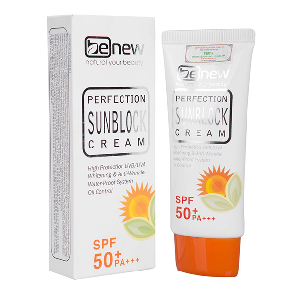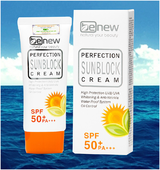 Kem chống nắng BENEW PERFECTION SUNBLOCK có độ chống nắng cao SPF 50 PA+++ với 04 lớp màng lọc bảo vệ da khỏi tác động của tia tử ngoại UVA & UVB hiệu quả trong 12 giờ sau khi sử dụng giúp: Ngăn ngừa sự xuất hiện của các vết nám, xỉn màu, lão hóa và ung thư da...do tác hại của ánh nắng mặt trời. Đặc biệt kem có chứa thành phần Collagen, Lô hội và Sáp ong giúp làm trắng sáng làn da, tinh chất Trà xanh ngừa mụn, kiểm soát dầu. Kem chống nắng BENEW PERFECTION chịu nước cực kỳ hiệu quả và lâu bị rửa trôi trong môi trường nước, giá của sản phẩm khoảng 130.000 đồng