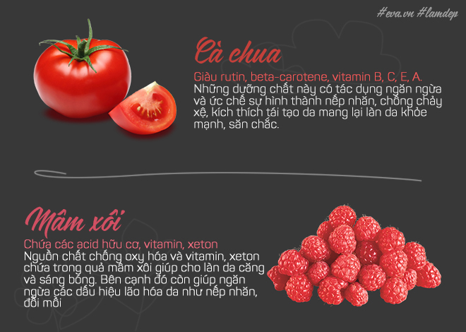 Để làn da luôn khỏe mạnh và tươi trẻ lâu hơn, bạn hãy chăm sóc sắc đẹp thường xuyên với cà chua và mâm xôi.