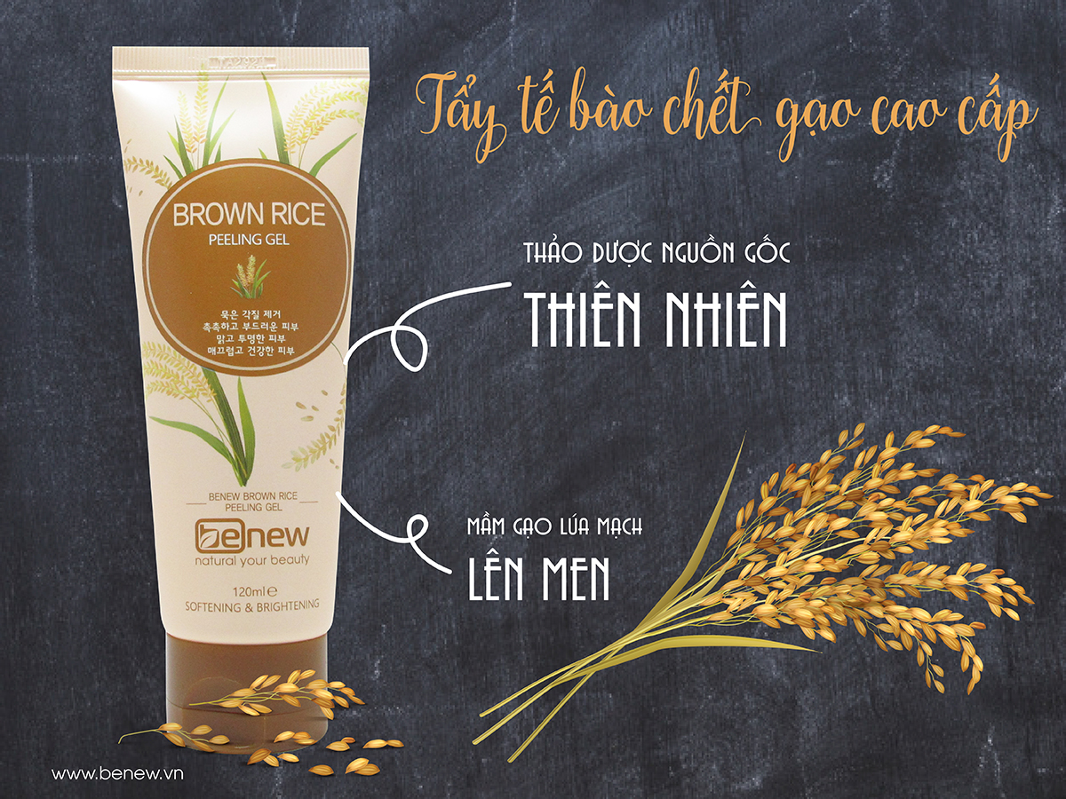 Công dụng: Chiết xuất từ mầm gạo lúa mạch lên men kế hợp với thảo dược nguồn gốc Thiên nhiên. BENEW BROWN RICE PEELING GEL giúp loại bỏ hoàn toàn lớp tế bào chết trên da, đồng thời làm sạch sâu lỗ chân lông, cuốn bay mọi bã nhờn, bụi bẩn. Các Vitamin từ mầm gạo lúa mạch không chỉ làm sạch lớp da chết cực kỳ hiệu quả, mà bột gạo còn làm sạch lớp dầu thừa, bổ xung các chất dinh dưỡng cho da đồng thời giúp ngăn ngừa hình thành các vết nám trên da, tăng độ ẩm và giúp làn da trở nên Trắng sáng tự nhiên. Thích hợp với mọi loại da, hiệu quả đặc biệt với da dầu.